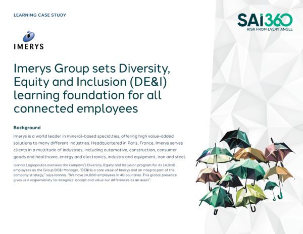 Imerys introduced the SAI360 Learning content in early 2020 to a specific group of senior and middle managers. “We wanted to monitor and gain feedback on enrollment, experience and outcomes,” says Ioannis. “The feedback from the group was excellent, so the Group DE&I and Group Learning Team expanded the training course to all connected employees globally. We appreciate that SAI360 could work with us on the stages and sizing, making it a smooth process. Today, our foundational training courses are available to all employees – to newly hired employees as well as for every employee as a reference point and refresher.”