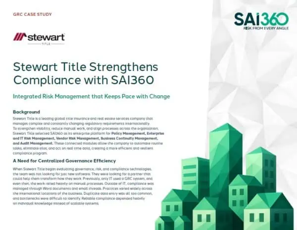 Stewart Title is a leading global title insurance and real estate services company that manages complex and constantly changing regulatory requirements internationally. To strengthen visibility, reduce manual work, and align processes across the organization, Stewart Title selected SAI360 as its enterprise platform for Policy Management, Enterprise and IT Risk Management, Vendor Risk Management, Business Continuity Management, and Audit Management. These connected modules allow the company to automate routine tasks, eliminate silos, and act on real time data, creating a more efficient and resilient compliance program.
