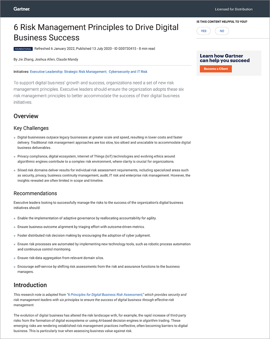 - Gartner, 6 Risk Management Principles to Drive Digital Business Success, Jie Zhang, Joshua Allen, Claude Mandy, Refreshed 6 January 2022, Published 13 July 2020.