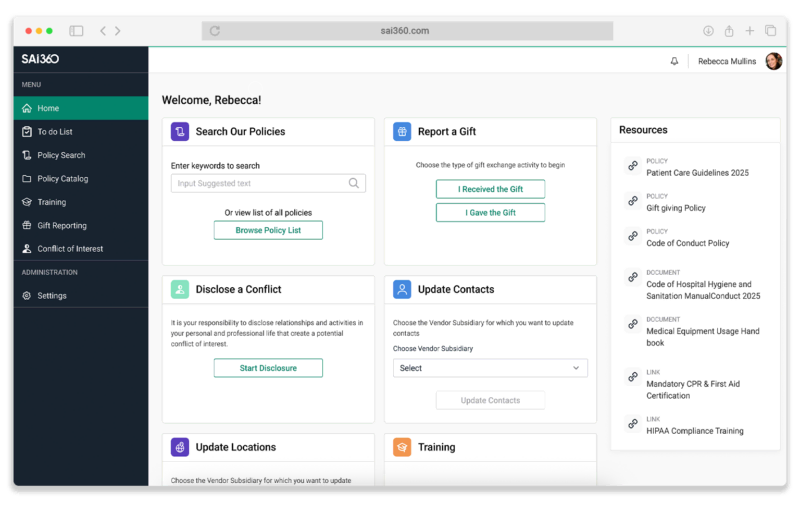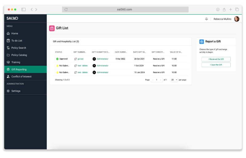 SAI360’s Gifts & Hospitality Compliance module simplifies how organizations track, manage, and report gift-related activity as an integrated part of the SAI360 GRC Platform.